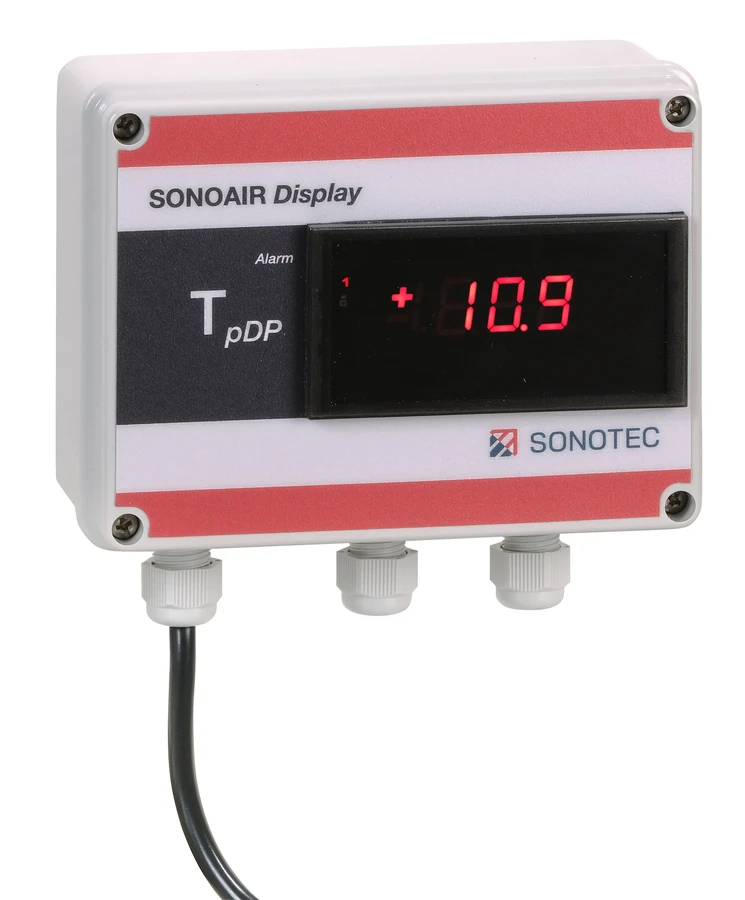 SONOAIR DM je externí displej pro zobrazení aktuální hodnoty teploty rosného bodu tlakového vzduchu ze snímačů řady SONODEW M. Současně se zobrazením hodnoty SONOAIR DM porovnává naměřenou hodnotu s nastavenou limitou a při jejím překročení spíná / rozpíná výstupní relé.